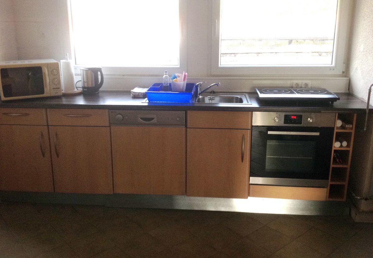 - große Wohnküche mit 17 qm2 ausgestattet mit Doppelinduktionskochfeld, Backofen, Mikrowelle, großer Kühlschrank, Spülbecken und Spülmaschine, sowie Toaster, Kaffeemaschine (Pads) und Wasserkocher